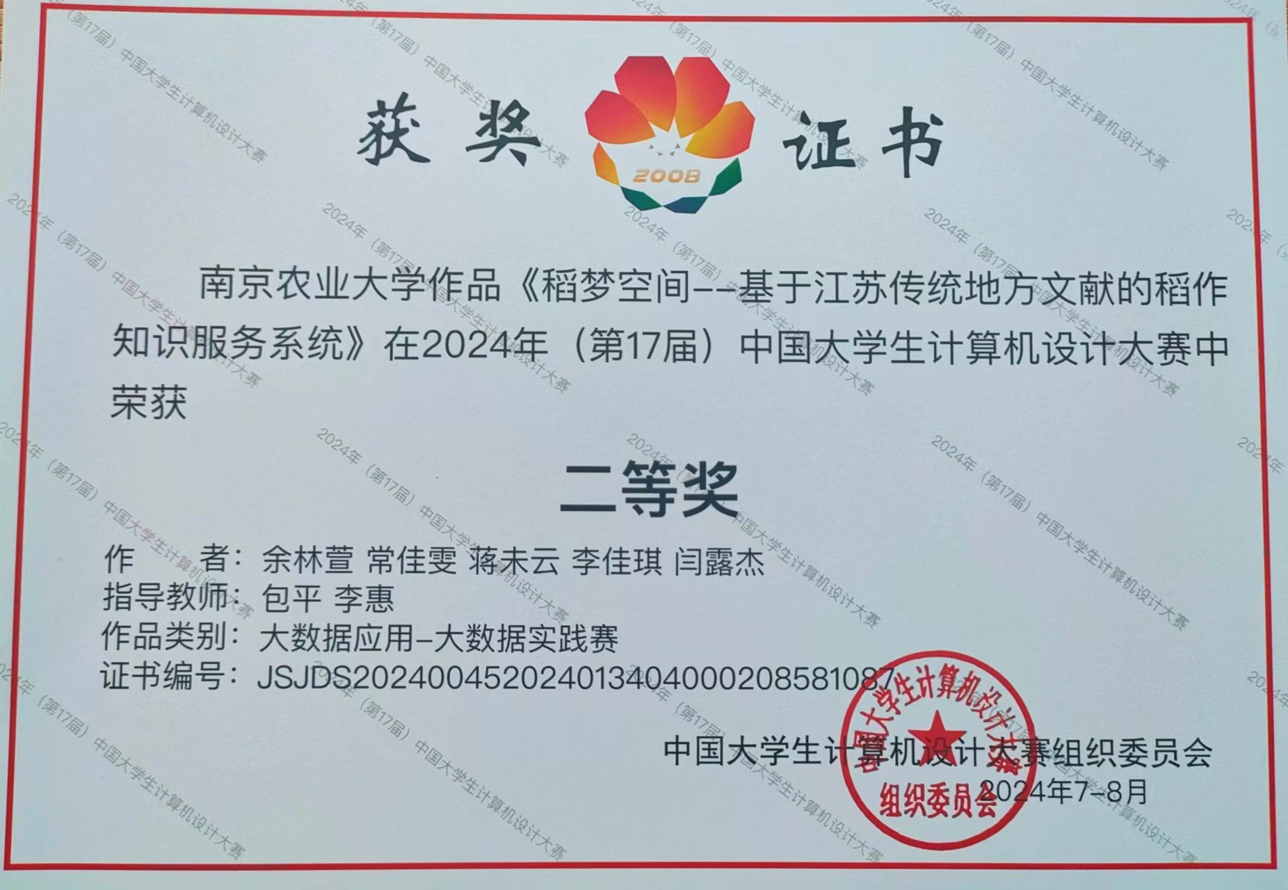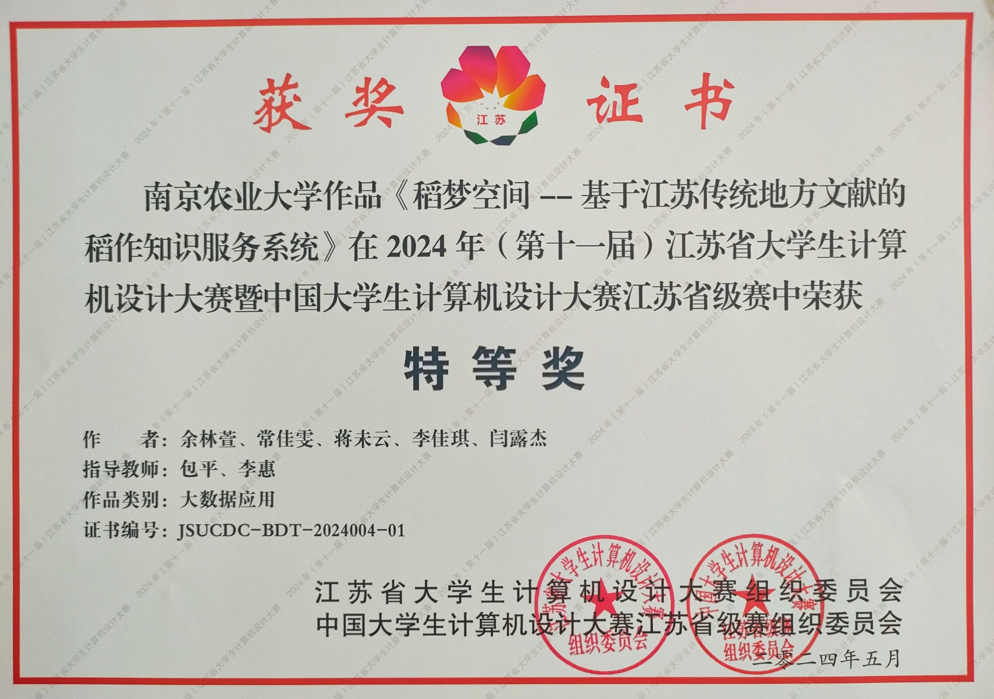 7月20日,2024年(第17届)中国大学生计算机设计大赛“大数据应用、数媒游戏与交互设计”赛道决赛,在上海对外经贸大学松江校区圆满落幕。本次比赛汇聚了全国32个省份290余所高校的459组作品,经现场答辩与专家评审,本校做爱片 选送作品《稻梦空间——基于江苏传统地方文献的稻作知识服务系统》从全国优秀学子的激烈角逐中脱颖而出,荣获全国决赛二等奖及江苏省省赛特等奖,指导教师包平、李惠获得“优秀指导教师”称号,这是我校在该赛道中首次获得此殊荣。