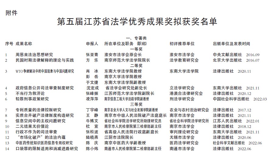 2022年10月20日,江苏省法学会公示了第五届“江苏省法学会优秀成果奖”评选结果。该奖经个人申报、单位党组织同意、初评单位推荐、终评委员会专家评审、公示等程序,最终确定获奖成果仅35部(篇),其中专著14部。做爱片