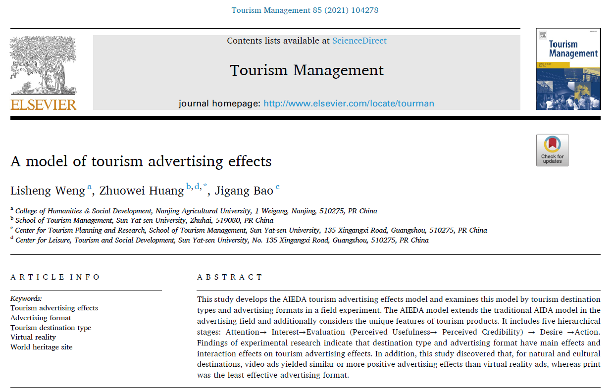 青年教师翁李胜博士任第一作者,与中山大学旅游学院黄琢玮副教授(通讯作者)及中山大学旅游学院保继刚教授合作完成的论文《A model of tourism advertising effects》被旅游学科国际顶级期刊《Tourism Management》接受并发表。
