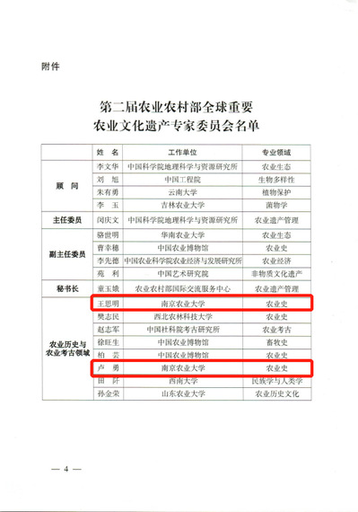 近日,国家农业农村部办公厅正式公布第二届全球重要农业文化遗产专家委员会名单,我校中华农业文明研究院院长王思明教授、中华农业文明博物馆常务副馆长卢勇教授成功入选专家委员会名单。