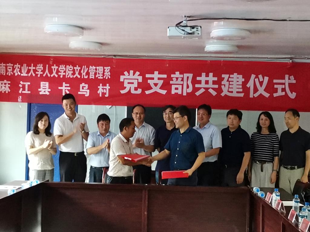 19日上午,调研组首先来到麻江县宣威镇卡乌村。在卡乌村,调研组与该村负责人围绕卡乌村的产业发展、文旅开发、社区建设等进行了座谈。卡乌村主任金德周介绍了卡乌村基本情况、扶贫产业发展面临的主要问题。卡乌村党支部第一书记胡锦昊介绍了卡乌村党建引领助推脱贫攻坚的主要做法。姚兆余院长介绍了人文学院的专业发展、特色和优势,希望通过双方持久、深入的合作,将卡乌村打造为校村共推的乡村振兴试验区和示范区。杨旺生教授结合卡乌村资源优势和产业发展现状,从资源整合、农产品销售、景村结合等方面对卡乌村发展提出了思路。各位系主任围绕农民合作社、文化遗产保护与利用、乡村旅游开发、农村法治建设等进行了深入交流。座谈会结束后,金德周主任和李明主任分别代表卡乌村和人文学院文化管理系签订了党支部共建协议。