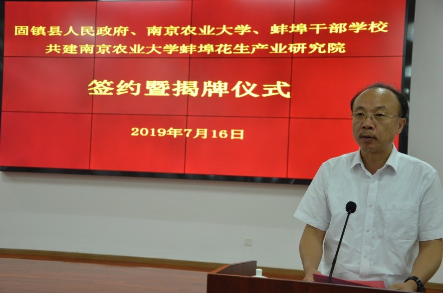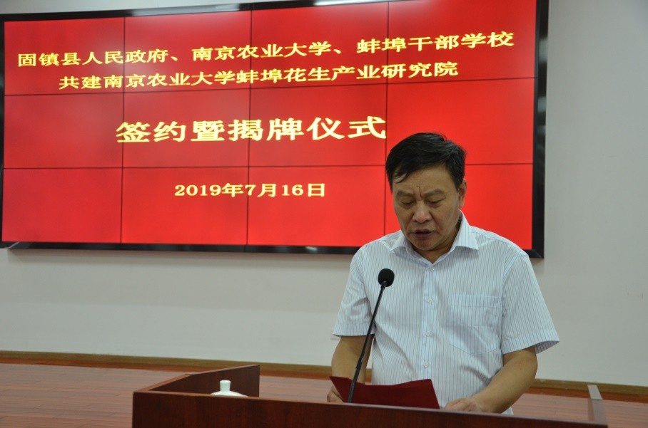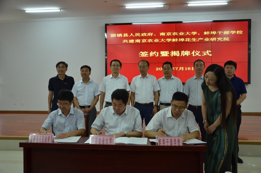 蚌埠花生产业研究院签约暨揭牌仪式在蚌埠干部学校举行。我校党委常委、副校长丁艳锋、社会合作处处长陈巍、人文学院党委副书记冯绪猛以及部分专家,蚌埠市市委常委副市长郭鹏、固镇县委书记吴永斌、副县长张允武以及蚌埠市发改委、科技局、人社局、自然资源及规划局、农业农村局负责人,江苏省农科院休闲农业所所长周建涛、经济休闲所副所长沈新莲,蚌埠干部学校党委书记张军、校长李安东、副校长万敦友等出席此次签约揭牌仪式。