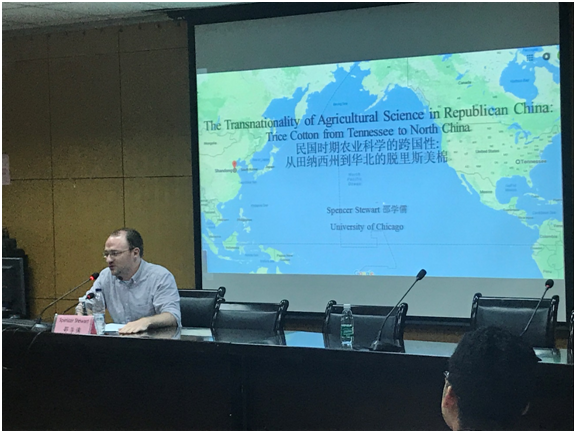 中华农业文明研究院邀请,芝加哥大学历史学院博士候选人Spencer Stewart(邵学儒)以“民国时期农业科学的跨国性:从田纳西州到华北的脱里斯美棉”为题,为科技史专业的学生带来一场精彩的学术报告。