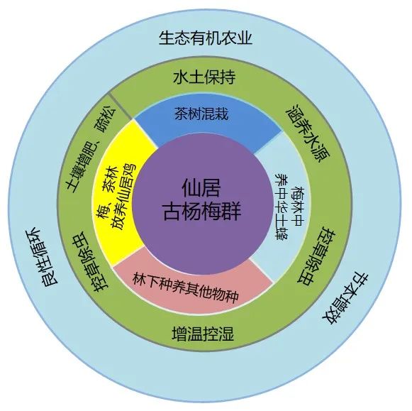 近7年来,团队围绕全球重要农业文化遗产倡议,协助地方政府从历史文化、系统功能、动态保护、发展战略等方面开展多学科综合研究,借助技术指导、示范带动等多种途径,对古杨梅树的分布区域、品种资源等进行细致摸底与数据建档,助力当地摸清古杨梅树家底,总结凝练“梅-茶-鸡-蜂”的山林利用模式,充分对接世界粮农组织专家与遗产地群众,构建起政府+学界+农户的三位一体农业文化遗产保护体系。