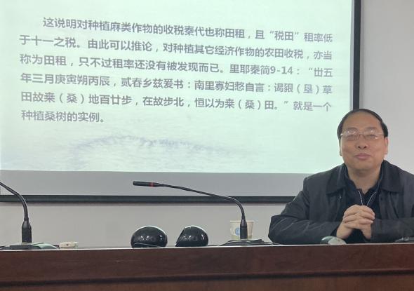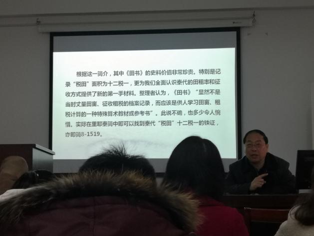 讲座中,晋文教授首先指出由于对秦朝“粟米之征”的官方租率传世文献未留下记载,因此很长一段时间学界对秦朝的田租的征收方式和标准众说纷纭,但根据近年出土公布的秦简,秦朝及汉初的田租征收方式等问题已得到解决。他列举了岳麓书院藏秦简中一部名为《数》的数学著作中几道涉及租率的算题,阐述了倾向于秦朝的某些统治区域曾实行“税田”十一之税的看法的原因。他还特别指出,种植麻类作物的收税秦朝也称田租,且“税田”租率低于十一之税。此外,他又提出北京大学藏秦简《算书》中的“税田”则是十二税一,并通过其他秦简中的内容加以佐证。通过秦简互证,他证明了秦及汉初的田租征收实际有两个同时参照的租率,一是“税田”占舆田的比例,即“税田”亩数租率;二是按农作物不同产量征收的数量租率。