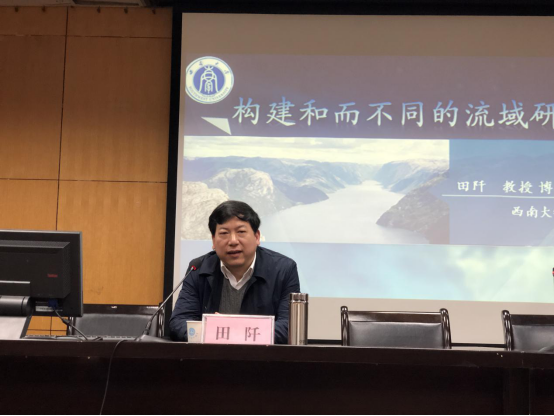 报告伊始,卢勇教授代表全院师生对田阡教授的到来表示热烈欢迎,并对田教授进行了简短的介绍。首先,田教授指出这次学术交流旨在在学习和借鉴历史的学者关于流域研究的基础上,在新时代下让流域研究的视角、方法、新的分支学科的概念等方面展现出和而不同的学问。与此同时,田教授就自身的经历浅谈了从事人类学流域研究的缘由。随后,田教授就为什么研究流域发表了他的看法,他认为,将“流域人类学”发展成为一个有方法特色的民族学学术流派为愿景,提出“流域人类学”学术概念,构建了以流域为路径的理解区域文化的方法体系,逐步搭建了族群与区域文化理论构建,实现了以项目带研究,以研究育社会,将民族学特色的新视角和新理论与社会现实应用的有机结合。最后,田教授向我们讲解了流域人类学的概念、研究构想以及研究视角。他指出,流域人类学是指一河流为中心,以水为纽带,视人—地—水相互的作用为自然—社会综合体,将上中下游与左右岸的自然和人类群体连接为一个不可分割的整体。从人与自然关系的角度,重新阐释人类文明起源、发展与衰退的原因,重新认识区域文化,进而重新阐释人类社会,最终实现重构和谐的人与自然、社会关系的目标。
